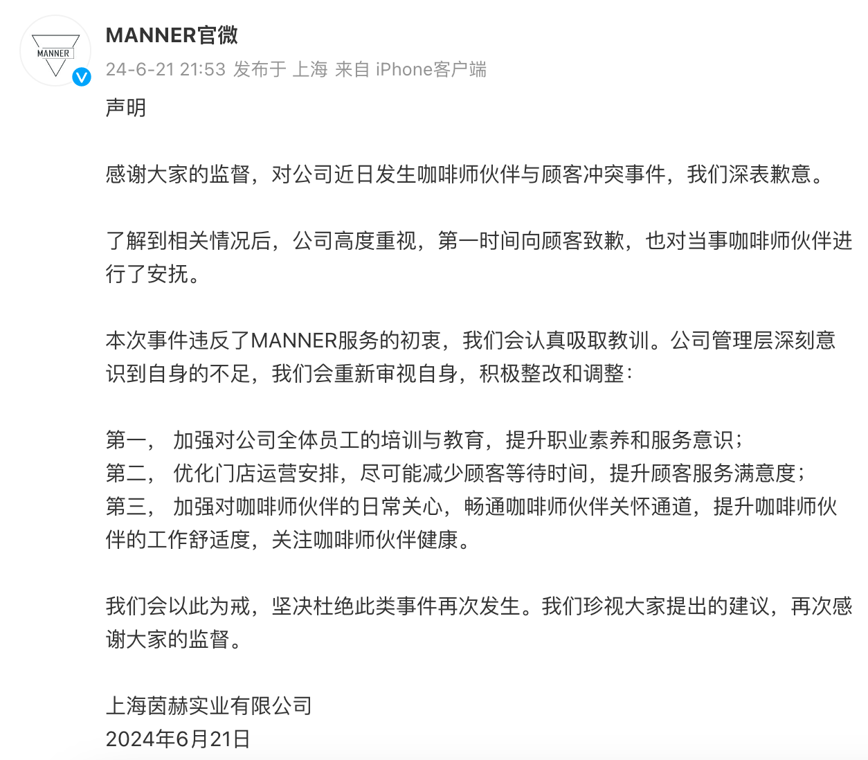 6月21日晚间,@MANNER官微 发文称,对公司近日发生咖啡师伙伴与顾客冲突事件,深表歉意。