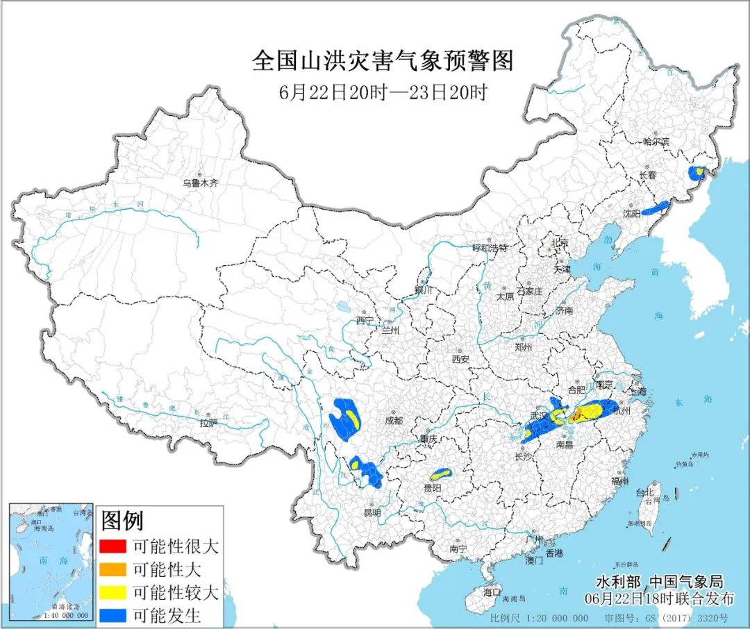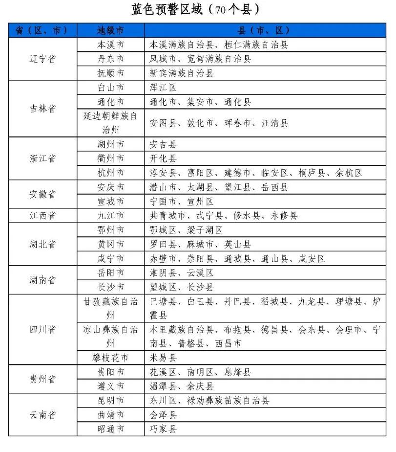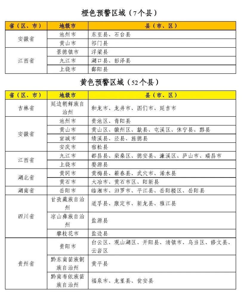 预计,6月22日20时至6月23日20时,吉林东部、安徽南部、江西北部、湖北东部、湖南东北部、四川中南部、贵州中部等地部分地区发生山洪灾害可能性较大(黄色预警),其中,安徽南部、江西北部局地发生山洪灾害可能性大(橙色预警),预警区域涉及的县(市、区)见下表。其他地区也可能因局地短历时强降水引发山洪灾害,请各地注意做好实时监测、防汛预警和转移避险等防范工作。