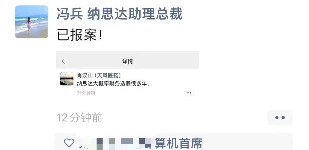 最近,金融圈知名人士肖汉山在朋友圈吐槽“纳思达大概率财务造假很多年”的截屏在社交媒体上流传了出来,引发广泛关注,纳思达助理总裁兼资本市场总监冯兵也在朋友圈回应:“已报案!”。