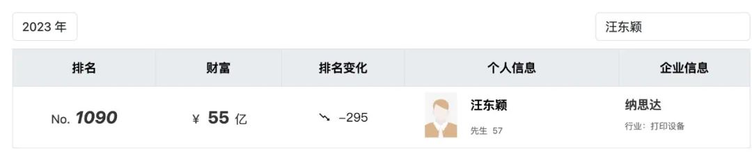 2018年以来,汪东颖常年蝉联胡润富豪榜单,2023年,汪东颖又以55亿身价位列《胡润百富榜》第1090位。