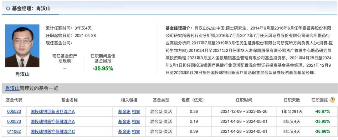 另据国投瑞银基金公告,今年5月1日,肖汉山卸任了国投瑞银医疗保健行业基金经理职务,离任原因是辞职。目前,肖汉山尚未明确“新下家”。