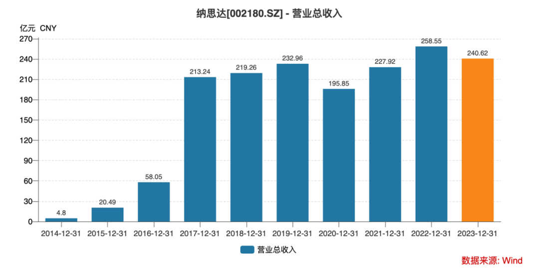 2023年,纳思达营业总收入240.62亿元,较上年同期下滑6.94%,归母净利润-61.85亿元, 较去年同期下滑432.02%。对比往年数据来看,这是纳思达自2014年借壳上市以来业绩表现最差的一年。