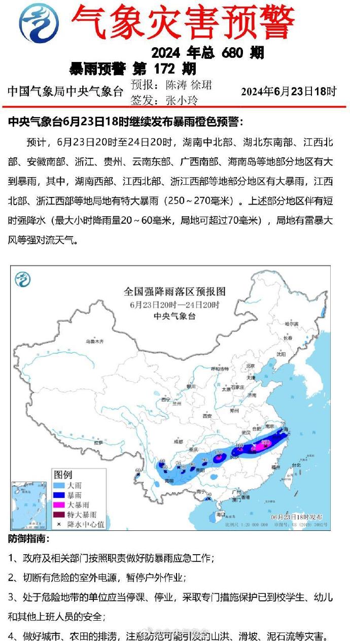 中央气象台6月23日18时继续发布暴雨橙色预警:预计,6月23日20时至24日20时,湖南中北部、湖北东南部、江西北部、安徽南部、浙江、贵州、云南东部、广西南部、海南岛等地部分地区有大到暴雨,其中,湖南西部、江西北部、浙江西部等地部分地区有大暴雨,江西北部、浙江西部等地局地有特大暴雨(250~270毫米)。上述部分地区伴有短时强降水(最大小时降雨量20~60毫米,局地可超过70毫米),局地有雷暴大风等强对流天气。
