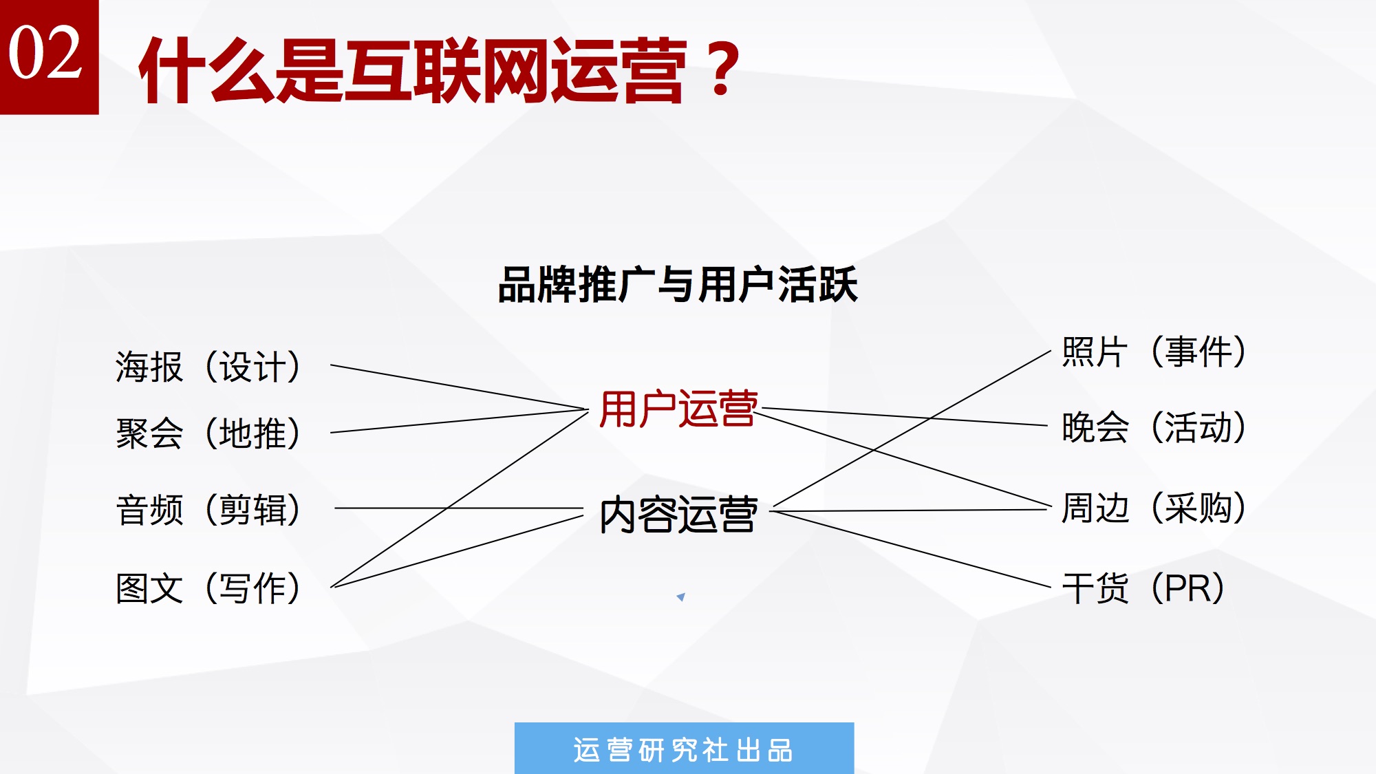 运营是在优质的产品和服务的基础上,以实现拉新、促活、转化、品牌为目的的并且在保证用户体验为底线的一系列运营手段集合,同时以运营对象的不同来做岗位的细化。