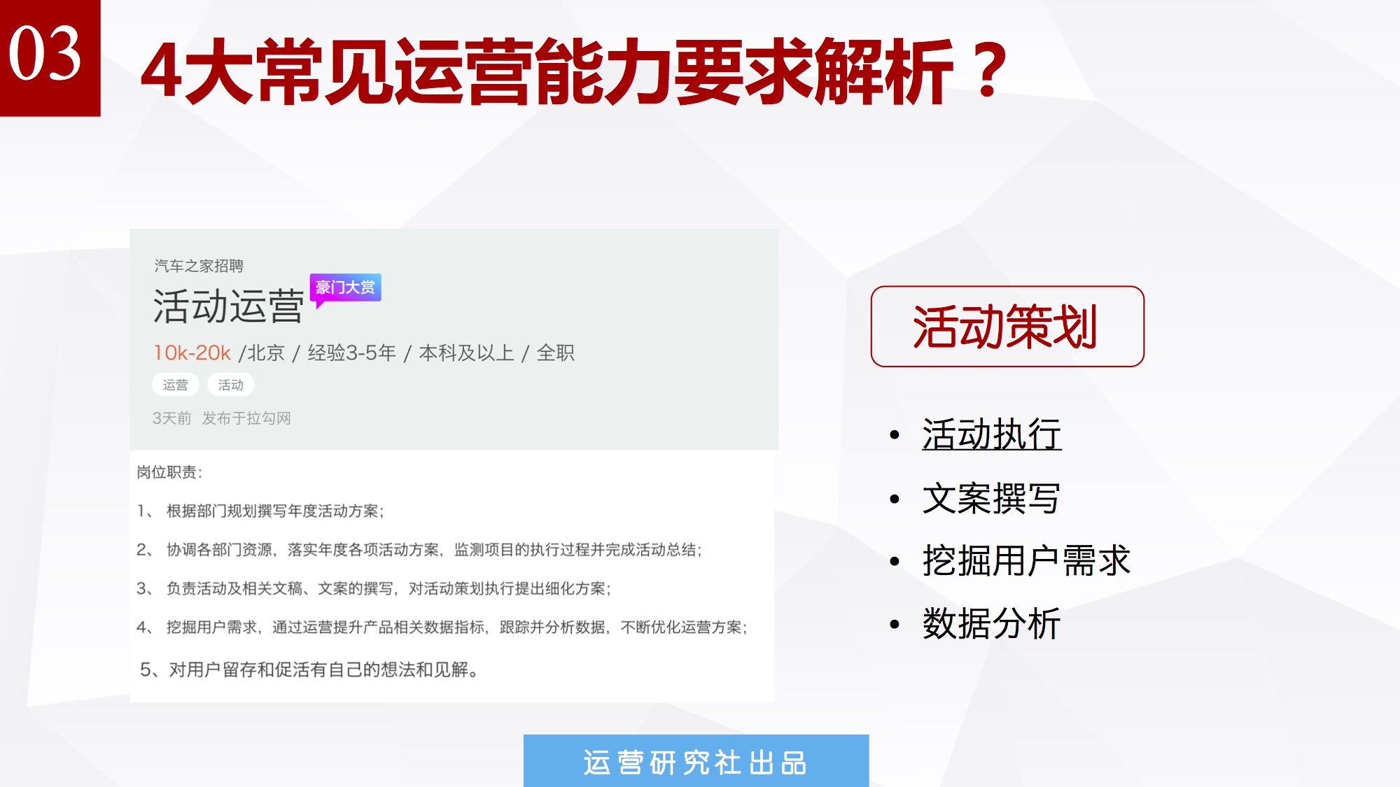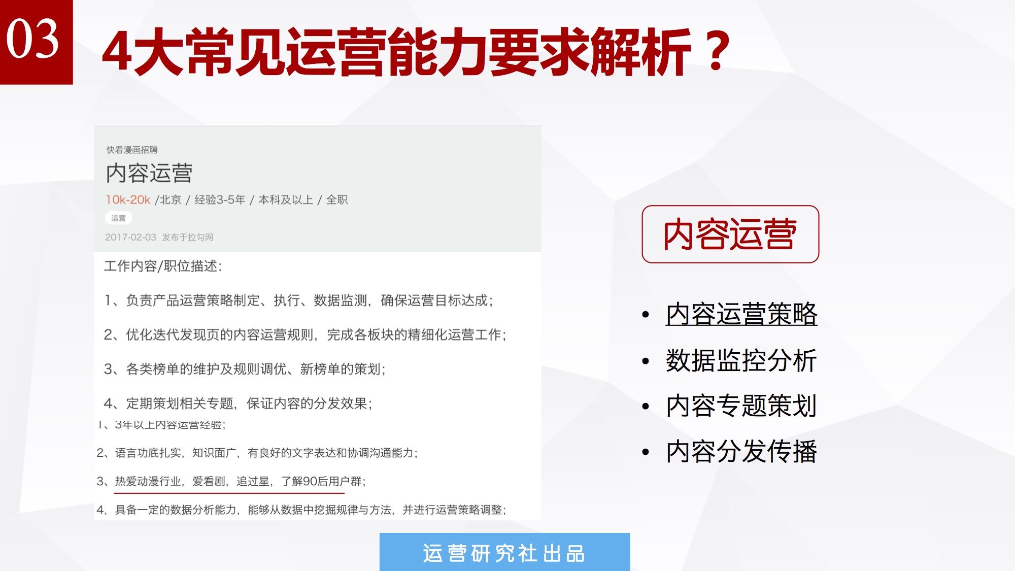 上图中,每一项运营手段都相对应一项能力,而我们主要是围绕用户运营和内容运营这两个工作岗位进行展开的。这里怎么去区分用户运营和内容运营?就是根据运营对象,如果你的运营对象是用户的话,那你就是用户运营,如果你对象是内容的话,你就是内容运营。