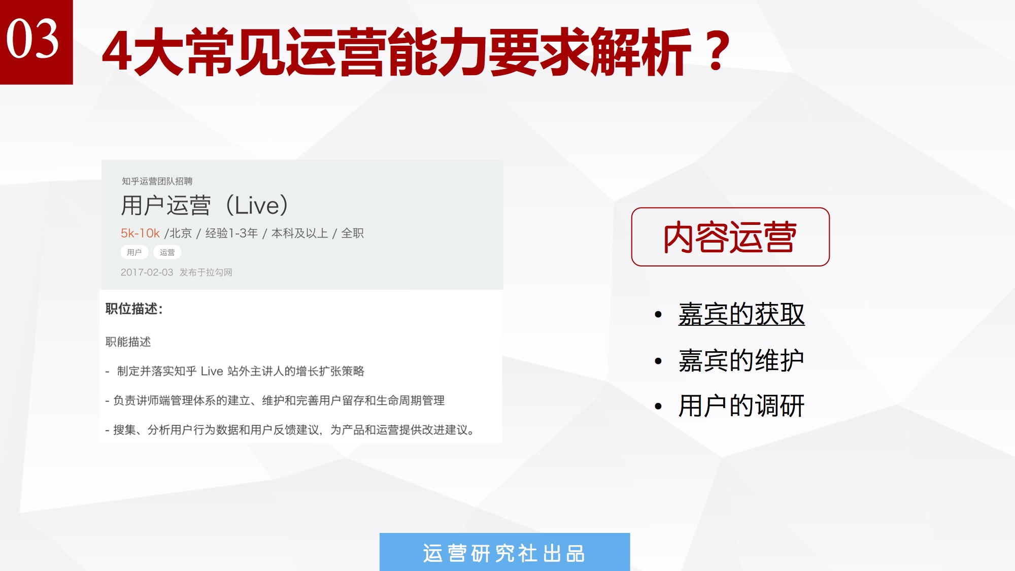 总的来说知乎Live内容运营岗位要求的核心是,嘉宾资源沟通能力,嘉宾维护能力,以及用户调研能力。