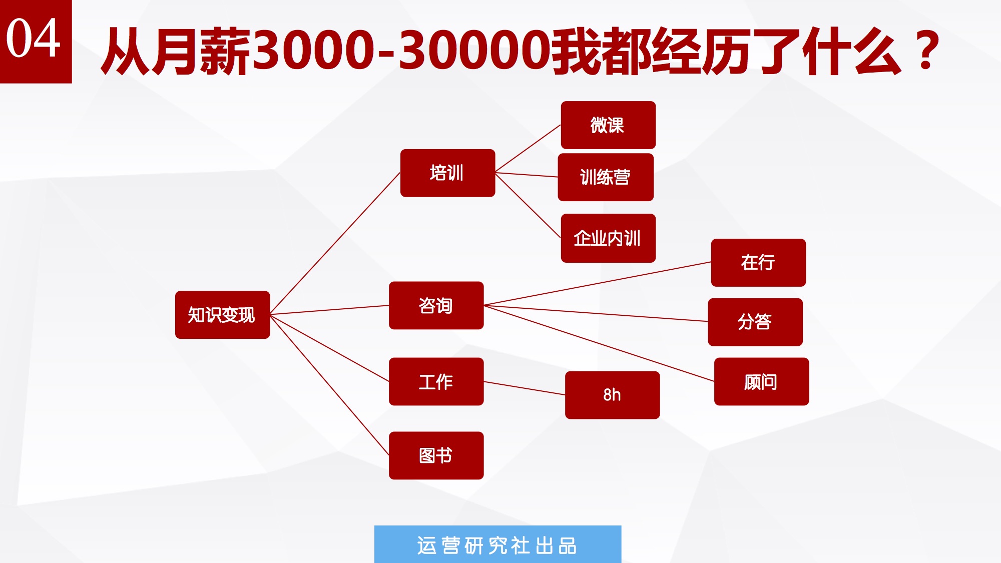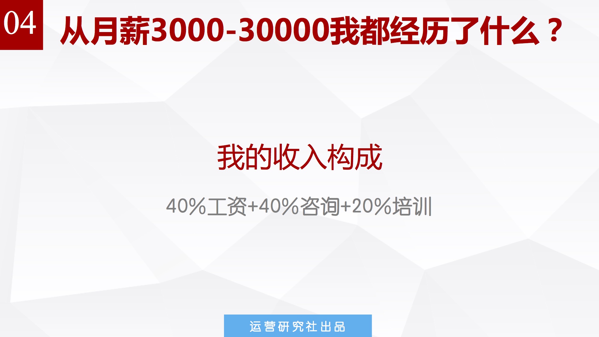 我现在的薪资收入结构,40%来自工资,40%来自咨询,20%来自培训。这也是我刚刚开始说的,运营是一个有前途的岗位。因为你做好之后你的额外收入会比你的工资收入还高。