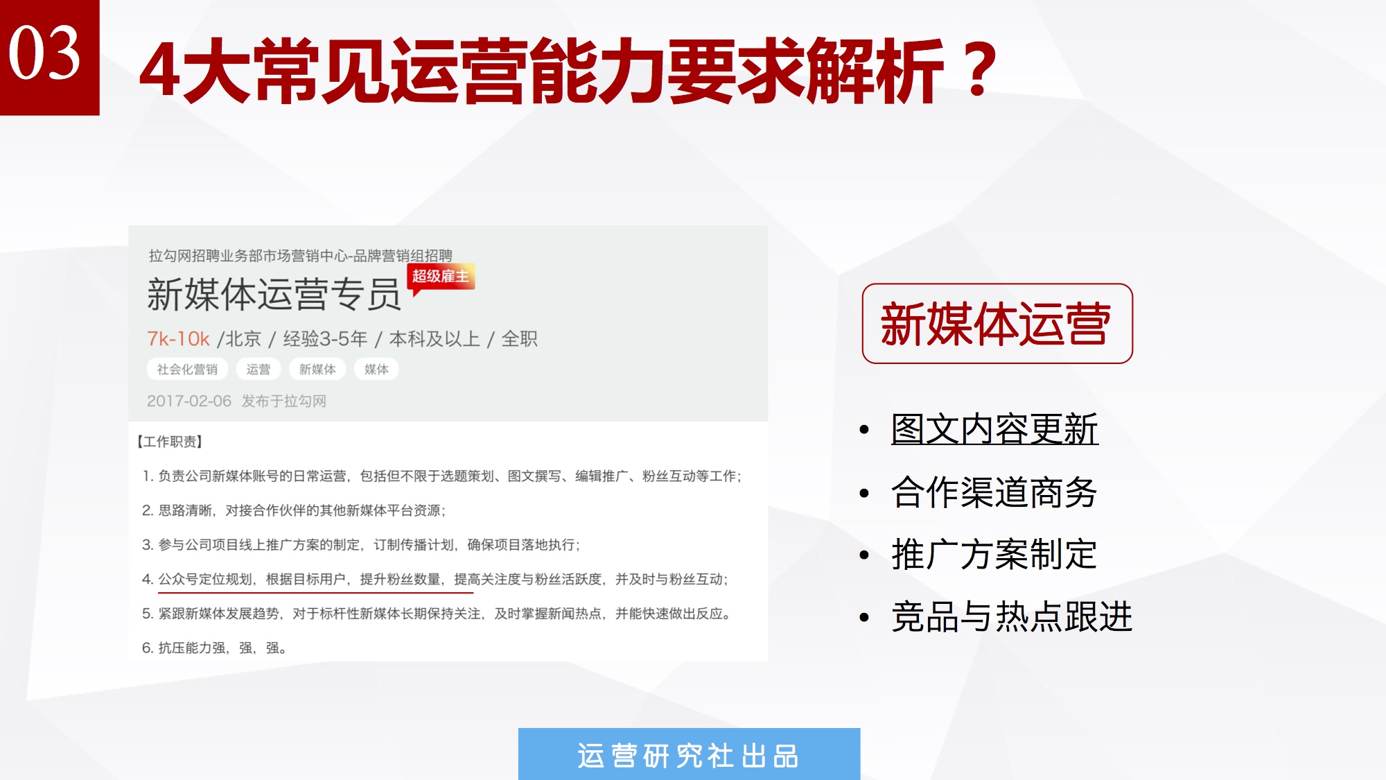 总的来说拉勾网的新媒体运营需要有图文内容更新能力,商务合作能力,推广方案的制定能力,还有竞品和热点的跟进能力。