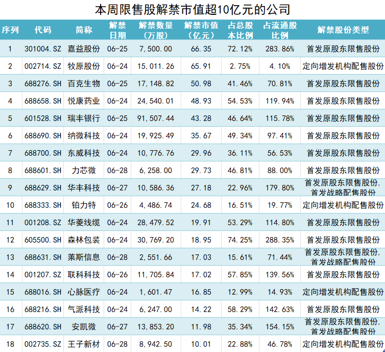 本周解禁市值超过10亿元的公司有18家。嘉益股份(301004.SZ)、牧原股份(002714.SZ)和百克生物(688276.SH)三家公司解禁市值均超过50亿元。