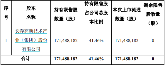 此次解禁仅有公司大股东长春高新一位,影响有限。
