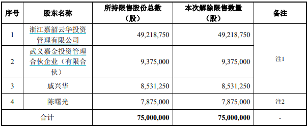 此次解禁股东共四位,包括实控人戚兴华、陈曙光和浙江嘉韶云华投资管理有限公司、武义嘉金投资管理合伙企业,四者为一致行动人。因此,嘉益股份此次解禁压力也有限。