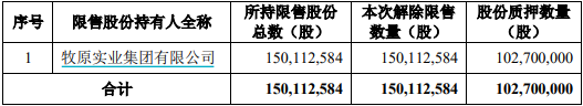 这是牧原股份18个月前定增发行的股份,当时发行价为39.97元/股,公司最新收盘价43.91元/股,算上分红收益,股东解禁收益率约10%。