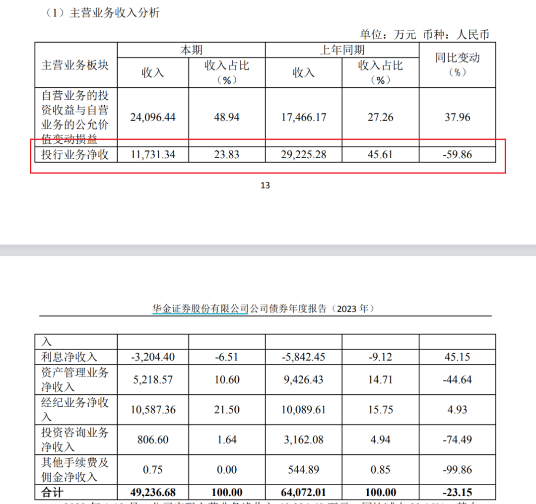 实际上,投行保荐和公司债券承销业务从2022年11月至2023年9月,暂停了10个月左右。2023年,华金证券投行业务净收入为1.17亿元,同比下降59.86%,收入占比也从45.61%降至23.83%。