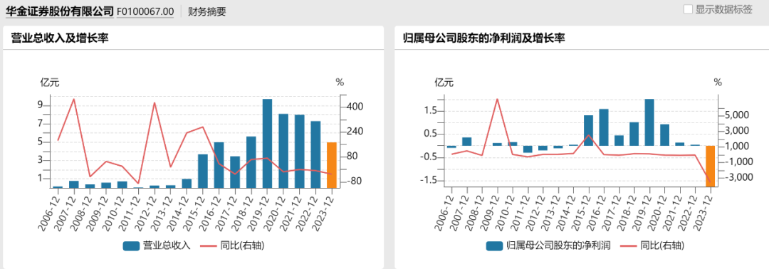 2023年,华金证券的资产管理业务净收入、投资咨询收入同比降幅均较大。