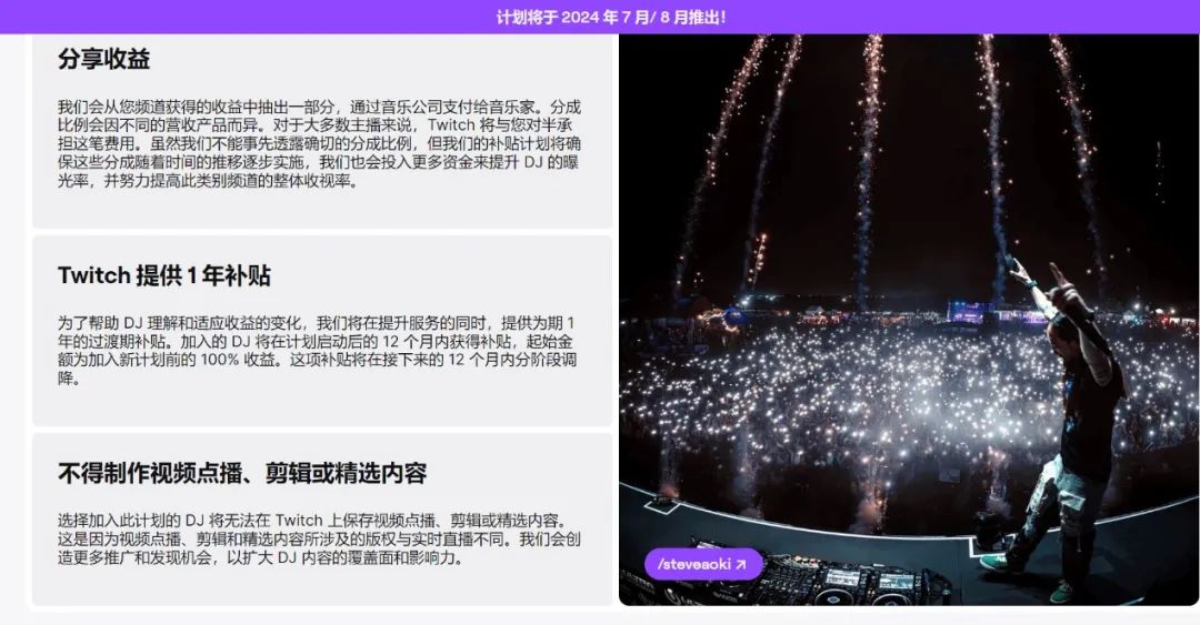为了让DJ们适应新的付费机制,不必担心收入在短期内因平台规则下降,所有加入该计划的DJ在第一年都会获得Twitch的经济补贴,用于弥补因版权分成造成的收益差额,后续每个月逐步减少。