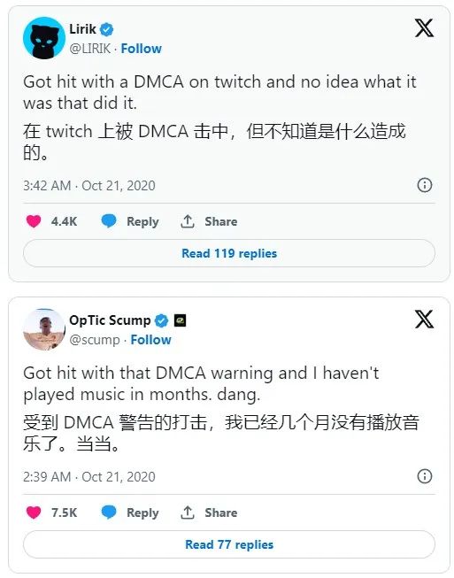 2021年5月,Twitch在收到约1000起侵权索赔后,公开喊话对音乐版权方的行为感到失望,称他们没有与Twitch讨论合理的解决方案,而是通过起诉和警告这种强硬的方式要求删除内容。