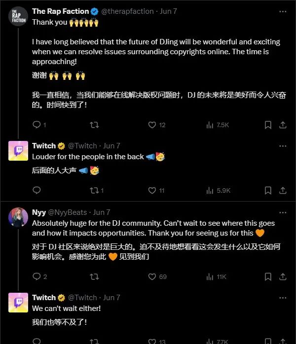 Twitch表示,之后会投入更多资金来提升DJ的曝光,并努力提高此类别频道的整体收看率。需要注意的是,由于视频点播、剪辑所涉及的版权使用方式与实时直播不同,因此暂时无法参与该项计划。同时,此次计划针对的是所有在直播中播放音乐的DJ、主播,不适用于现场演奏音乐(使用钢琴、吉他等)、游戏、聊天室直播间等场景。