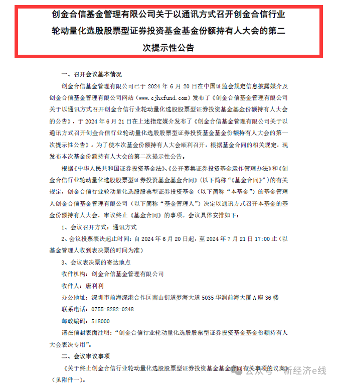 6月22日,创金合信基金发布第二次提示性公告称,为保护基金份额持有人利益,根据有关规定,公司经与基金托管人宁波银行协商一致,拟以通讯方式召开创金合信行业轮动量化选股股票型证券投资基金基金份额持有人大会,提议终止《创金合信行业轮动量化选股股票型证券投资基金基金合同》。会议投票表决起止时间:自2024年6月20日起,至2024年7月21日17:00止(以基金管理人收到表决票的时间为准)。