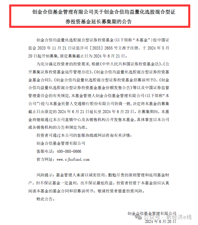 就在今年6月20日,创金合信基金还宣布旗下另一只主动量化产品发行延期。其公告表明,创金合信均益量化选股于2024年5月20日起开始募集,原定募集截止日为 2024年6月21日,现延长至2024年6月25日。
