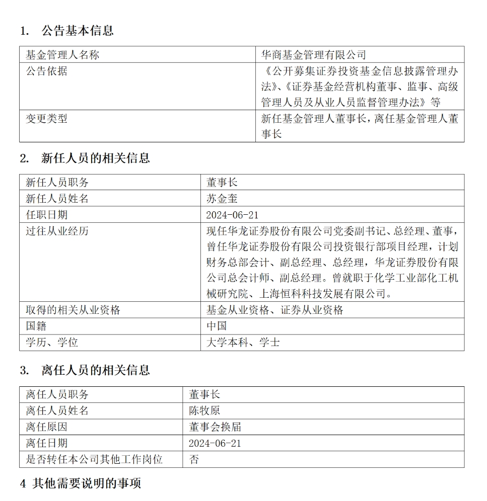 公告称,上述变更事项已经通过华商基金董事会审议,公司已按有关规定向相关监管部门备案,并将办理苏金奎担任公司法定代表人的工商变更登记等相关事宜。
