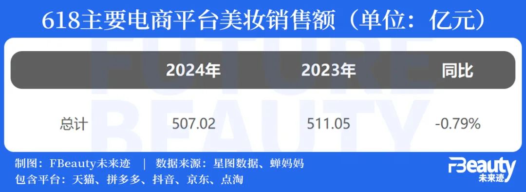 将这两大数据进行整合,可以发现,今年美妆618天猫、京东、拼多多等综合电商平台及点淘平台,加上抖音平台,共计卖出507.02亿元,相较去年的511.05亿元,同比下滑了0.79%。