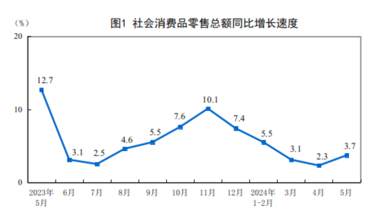 根据国家统计局发布的最新数据,今年5月,社会消费品零售总额39211亿元,同比增长3.7%。回顾去年5月到今年5月的社零大盘情况,仅有两个月为两位数增长,其余皆为个位数增长。