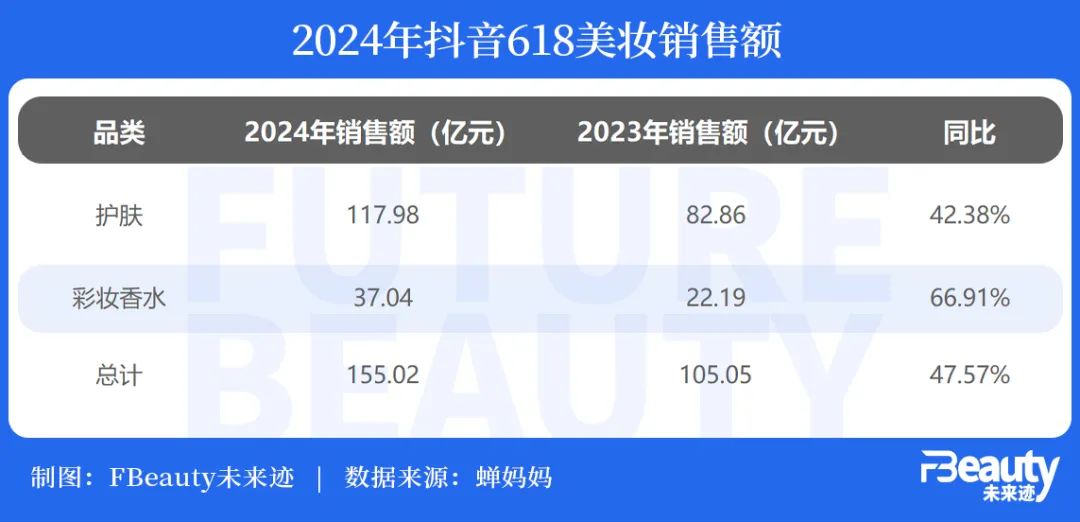 《FBeauty未来迹》从蝉妈妈获取到的数据显示,今年抖音618的护肤品类销售额达117.98亿元,同比增长42.38%;彩妆香水品类销售额达37.04,同比增长66.91%;这两大品类共计销售额达155.02亿元,同比增长47.57%。
