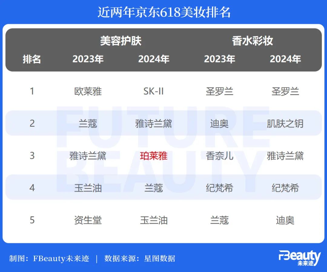 从京东平台的品牌榜单看,去年与今年,京东的美容护肤、香水彩妆两大品类前五,主要为外资品牌。不过,今年的美容护肤大类中,国货品牌珀莱雅首次冲进前五名,成为其中唯一的国货。