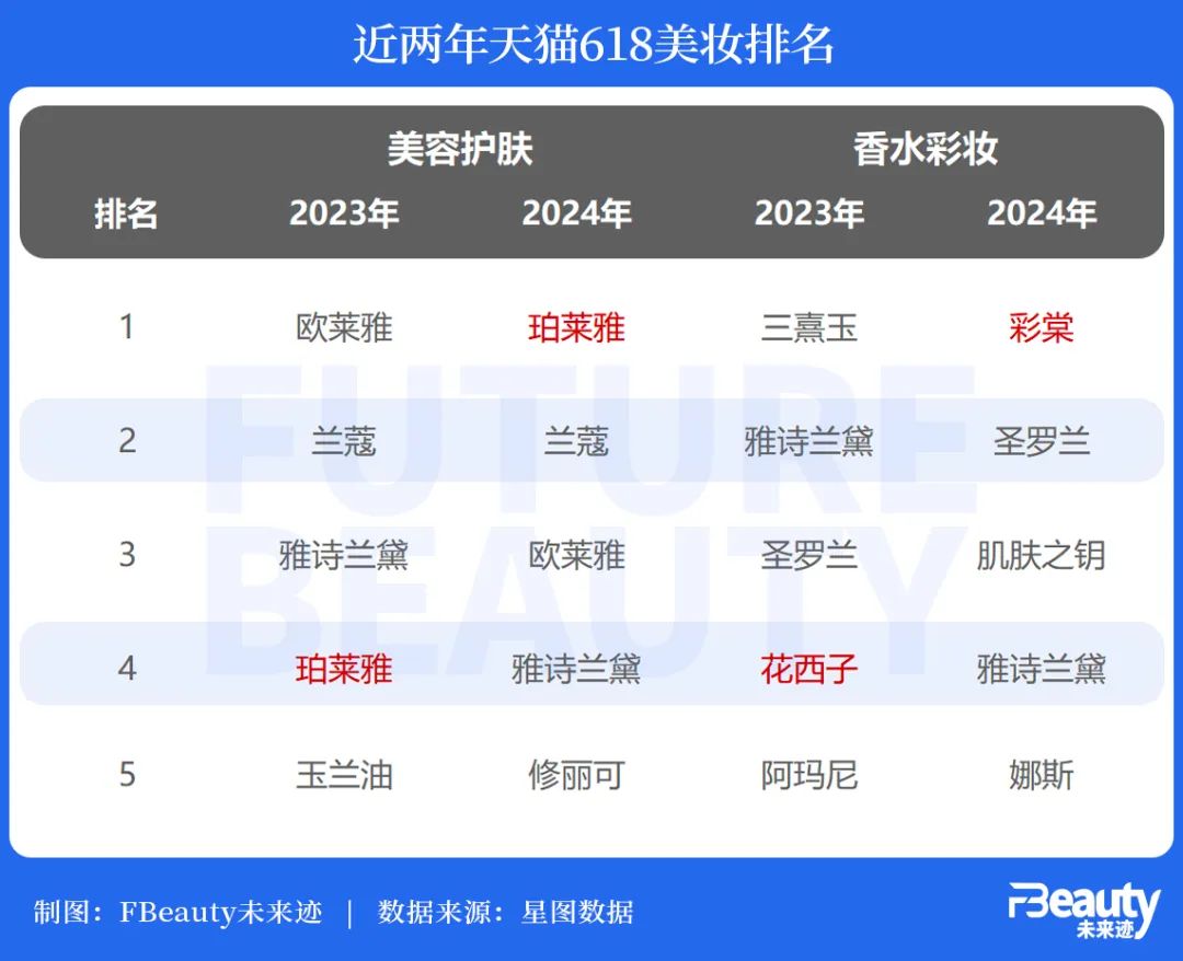 具体到品牌情况来看,星图数据显示,珀莱雅集团显然成为今年天猫618的最大赢家。在美容护肤品类中,珀莱雅超过兰蔻、欧莱雅、雅诗兰黛等一众外资品牌,成为第一;在香水彩妆品类中,彩棠超过圣罗兰、肌肤之钥等外资品牌,成为第一。