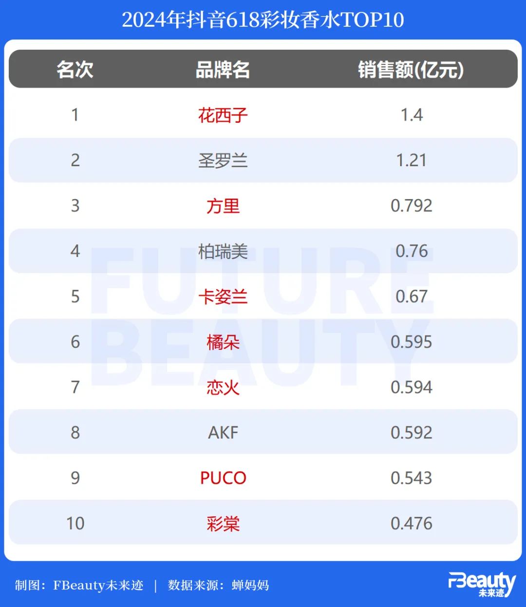 值得关注的是,在抖音彩妆香水品类中,国货品牌的表现非常出色,与外资品牌的比例为7:3,且花西子与方里分别占据第一、第三的席位。可以说,在抖音的彩妆香水赛道,国货品牌已经拥有明显优势。