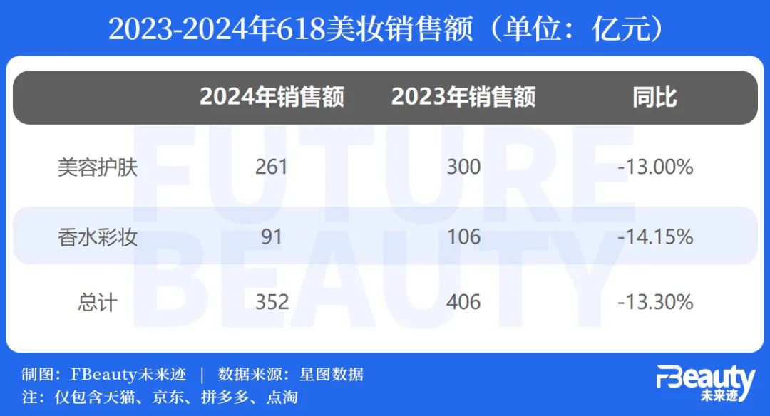 聚焦到美妆行业,今年618天猫、京东、拼多多、点淘的美容护肤销售总额为261亿元,同比去年的300亿元下降了13%;香水彩妆销售总额为91亿元,同比去年的106亿元,下降了14.15%。综合这两大品类,总体下滑了13.3%。