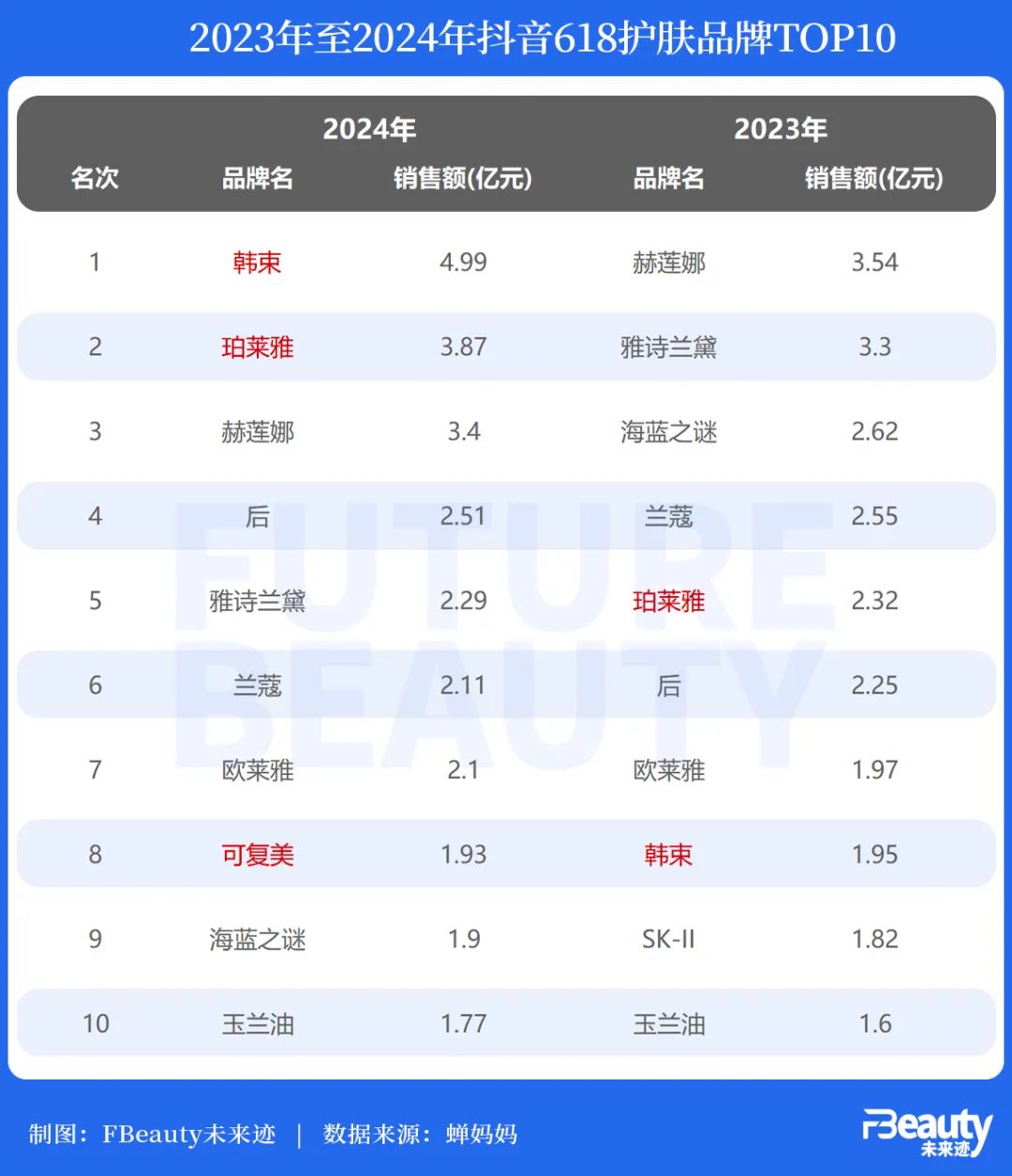 抖音的品牌榜单发生了较大变化。蝉妈妈数据显示,在抖音618护肤品牌TOP10排行榜中,韩束以4.99亿元的销售额位居品牌销量榜第一,珀莱雅以3.87亿元的销售额位列第二,赫莲娜以3.4亿元的销售额位列第三。