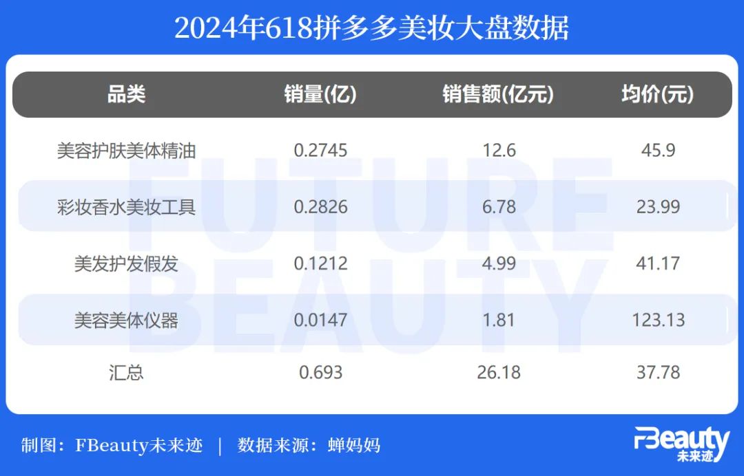 那么,备受追捧的拼多多在美妆板块表现又如何?根据婵妈妈数据,2024年618拼多多美妆品类中,各大品类的均价可以说是“低得出奇”,美容护肤美体精油、彩妆香水美妆工具、美发护发假发、美容美体仪器这四大品类汇总后的商品均价仅有37.78元,可以说是远远低于其它平台平均水平。