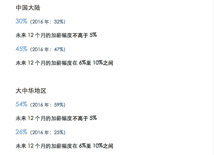 这是英国专业招聘顾问公司Michael Page在《2017年中国薪资与就业报告》中得出的结论。基于对中国大陆各领域近千名雇主的调研(其中40%受访雇主为中国本土公司,60%为外资跨国公司),Michael Page发现中国大陆地区有48%的受访雇主有新增员工人数的意愿,比2016年上升了2%;该比例在大中华地区为43%,比2016年下降了4%,据Michael Page华东区董事总监Peter Smith介绍,这主要是受到了香港地区金融行业和台湾地区制造业的负面影响。