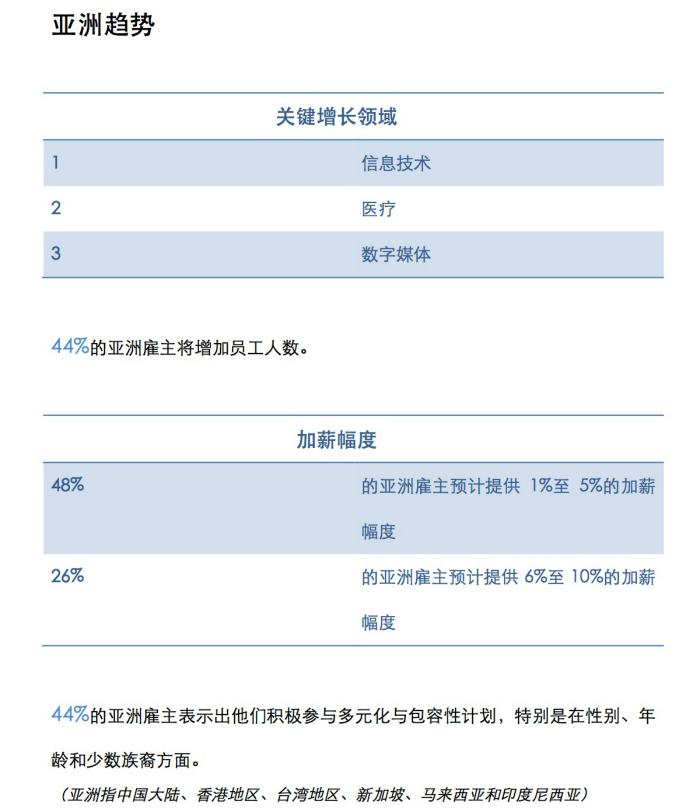 在亚洲范围内,Michael Page对来自中国大陆、香港地区、台湾地区、印度尼西亚、马来西亚和新加坡的3400多位雇主展开了在线调查。调查发现,信息技术、医疗和数字媒体是2017年增长最为迅速的三个领域。44%的亚洲雇主有增加员工人数的意愿,48%的亚洲雇主预计提供1%至5%的加薪幅度,26%的亚洲雇主预计提供6%至10%的加薪幅度。44%的亚洲雇主表示他们积极参与多元化与包容性计划,其中53%关注性别,42%关注年龄,34%关注少数民族群体。