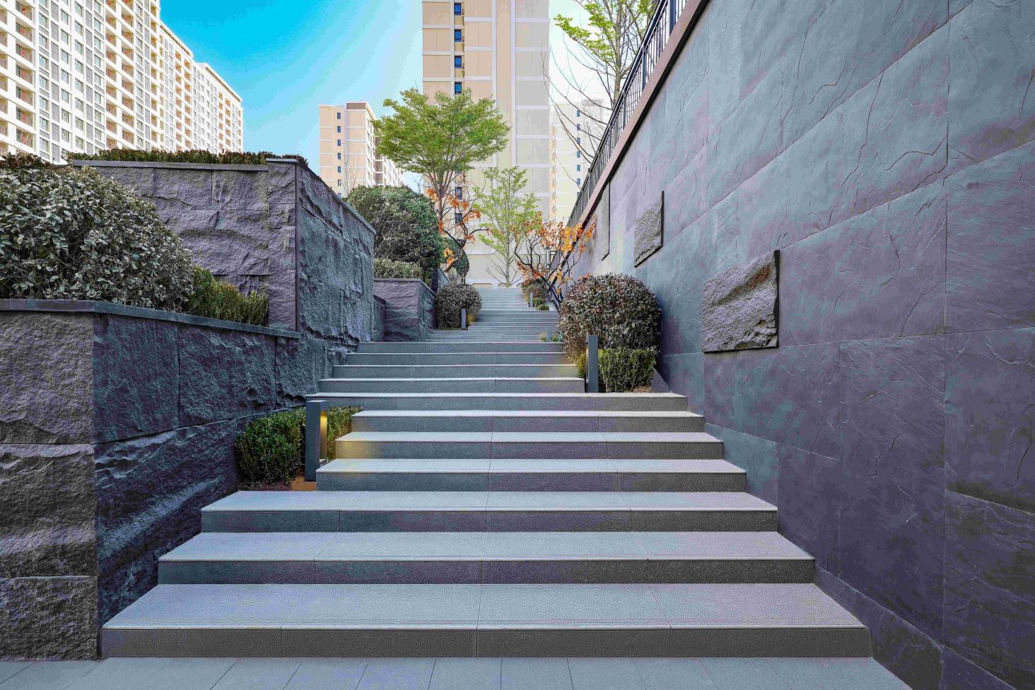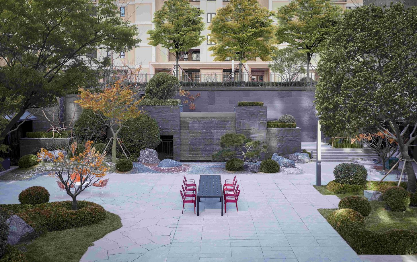 社区里配置了约1000m²的下沉庭院,增加了大乔珍贵树种,台阶采用左右错落,层次分明。
