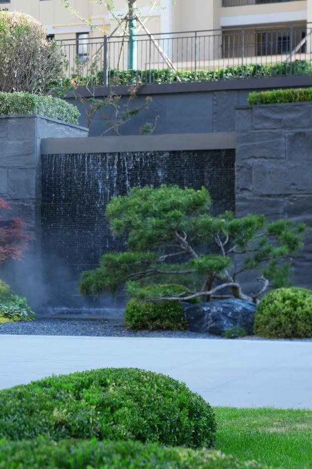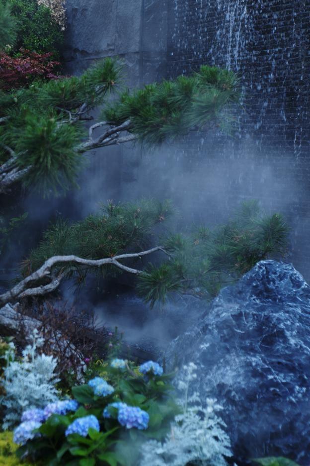 叠水幕布区域,增加了雾森系统,结合层叠水景,让归家的过程犹如身处山林中。