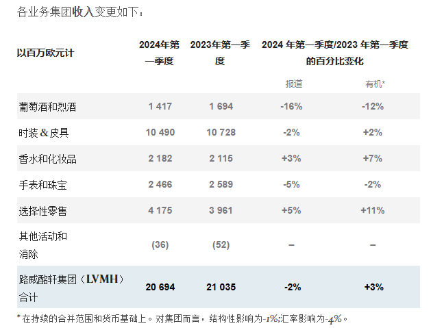 LV旗下轩尼诗干邑白兰地受美国谨慎补货和中国农历新年期间需求疲软影响,2024年Q1葡萄酒和烈酒有机营收暴跌12%,成为LV业绩下滑最严重的业务,直接拖累LV该季度业绩增长。