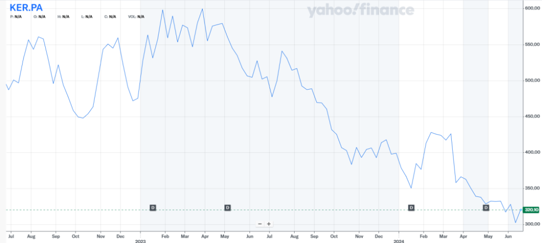 业绩持续恶化,开云集团股价从2023年7月527美元/股狂跌至今年的320.1美元/股,跌幅比例近40%。拉长时间线来看,近两年开云集团股价一直处在下行区间。