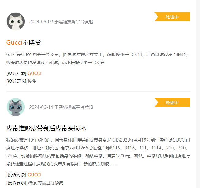 但开云集团在中国市场的销售培训明显不够,甚至可以说是缺乏同理心。在黑猫投诉上,有消费者投诉称,在GUCCI线下门店购买的皮带尺寸不合适,门店不进行换货。皮带维修后出现质量问题,不进行维修。
