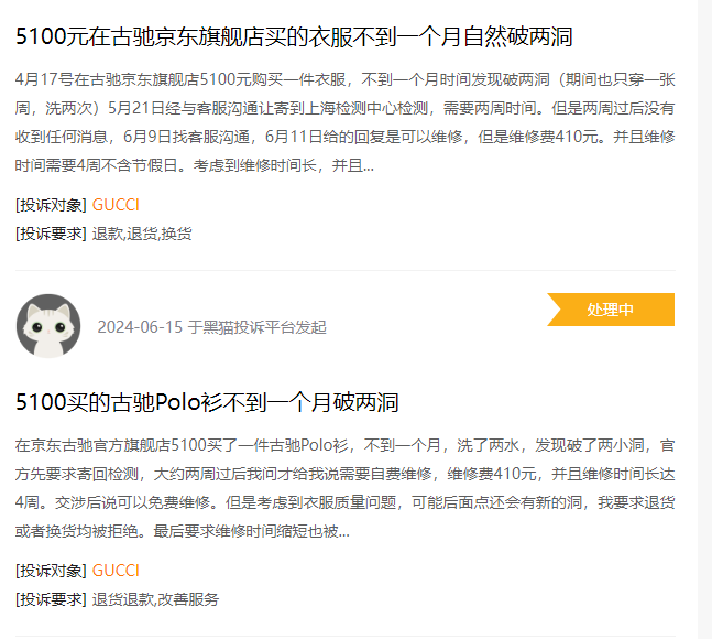 在线上平台,GUCCI购买的衣服出现损坏,要求GUCCI退货退款,GUCCI却无法满足客户需求。在近些年来的媒体报道中,GUCCI先后被曝女子在GUCCI品牌店试衣服被店员辱骂;消费者花费8500元买的老爹鞋,刚穿一周就开胶了,店员却称“这不是质量问题”等事件。