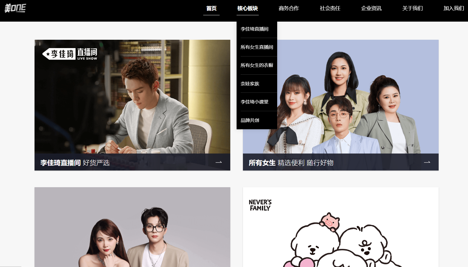 美腕官网显示,目前美腕的核心板块包括李佳琦直播间、所有女生直播间、所有女生的衣橱、奈娃家族、李佳琦小课堂、品牌共创。