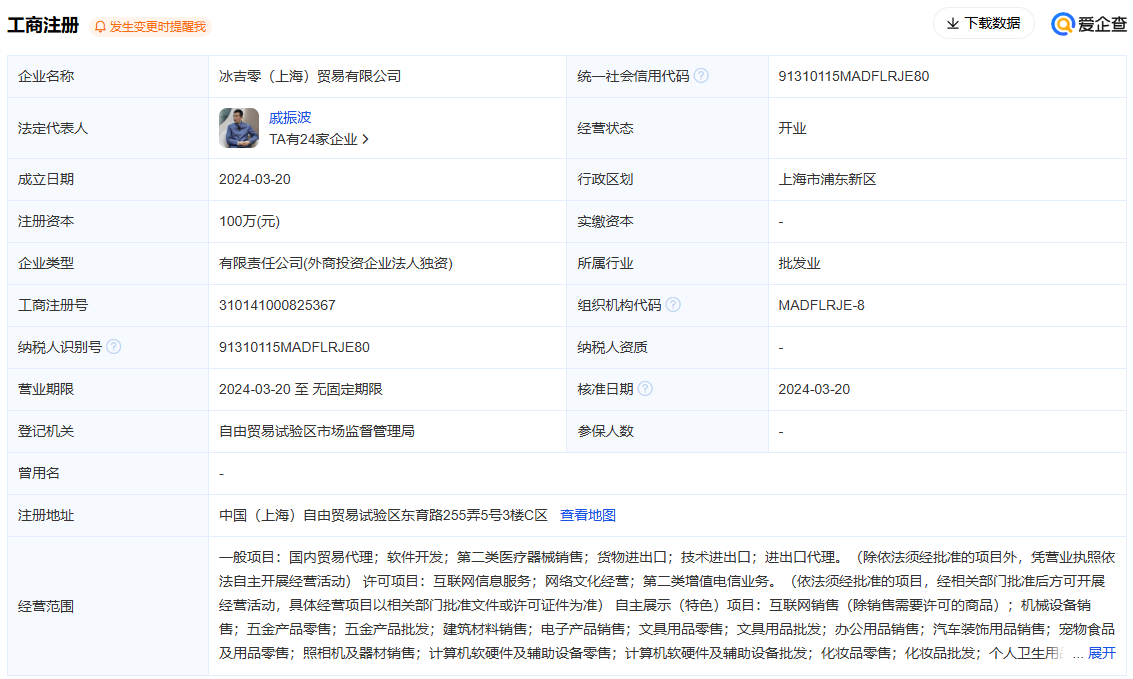 这次发力自有品牌是美腕首次和工厂供应商合作打造产品。据“美腕优选”天猫旗舰店店铺信息,其店铺经营者为冰吉零(上海)贸易有限公司。爱企查显示,冰吉零(上海)贸易有限公司成立于今年3月20日,注册资本为100万元。
