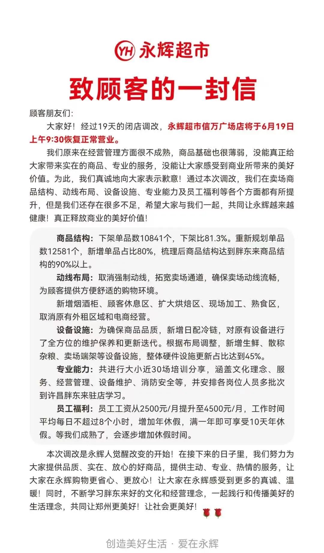 此次调改,胖东来从商品结构、动线布局、设备设施、服务及员工待遇提升等方面对其进行了“爆改”。比如商品方面淘汰下架单品数10841个,下架比81.3%,上新超10000个单品,门店商品结构达到胖东来商品结构的90%以上;卖场内取消了强制动线,拓宽卖场通道,取消了原来的外租区,扩大了烘焙区、现场加工、熟食区,增加了烟酒礼品区、顾客休息区等。此外,门店相比之前缩短了三个小时的营业时间,同时提高了员工的薪资待遇与福利,充分激发团队和员工的积极性。