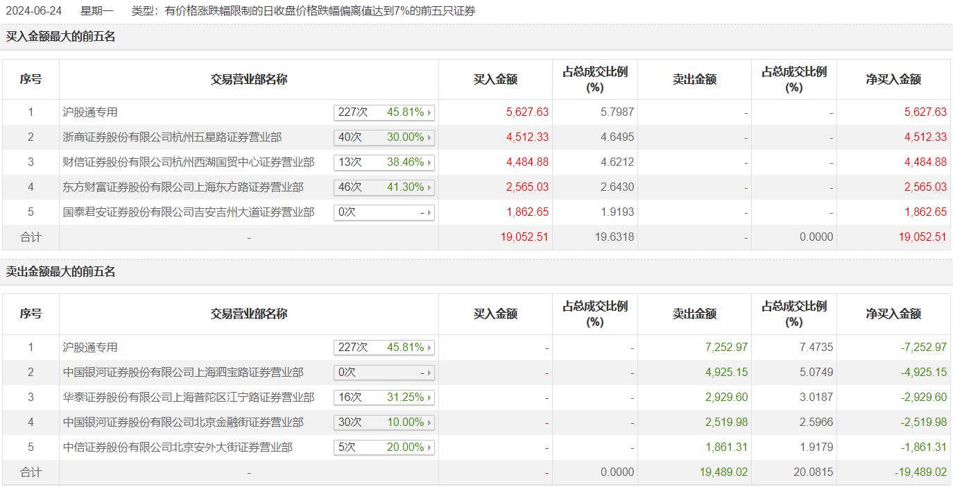 万通发展6月24日跌停,成交额9.70亿元,换手率5.25%,盘后龙虎榜数据显示,沪股通专用席位买入5627.63万元并卖出7252.97万元。