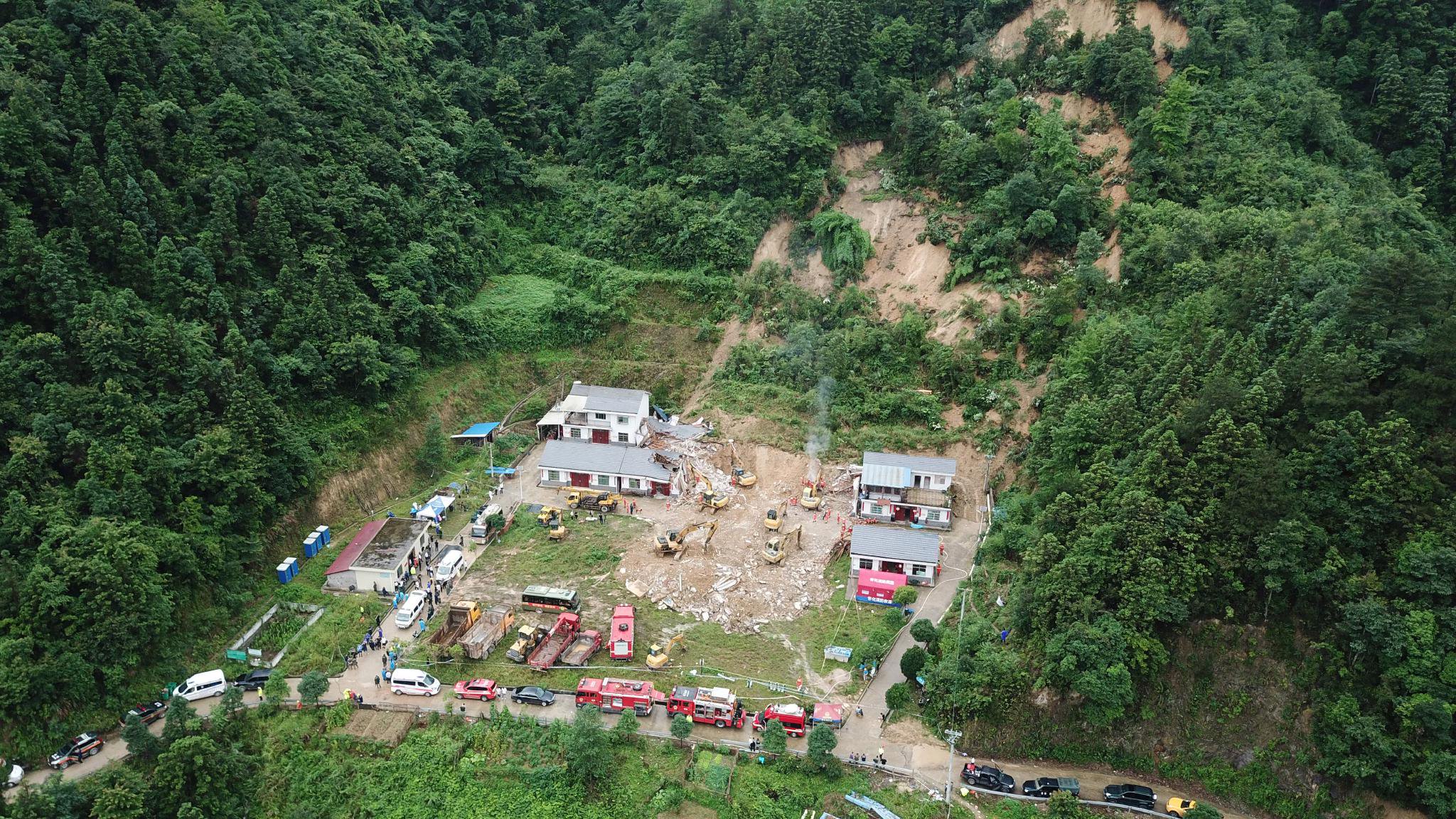 灾难现场图片显示,倒塌房屋是一层平房,墙体是水泥材质,有一整面墙体倾倒在地。房屋所在地三面环山,背后山体有明显的滑坡痕迹,据当地技术单位勘测,滑坡体长122米、宽88米,滑体厚度5米,滑坡体总方量约5万立方米。