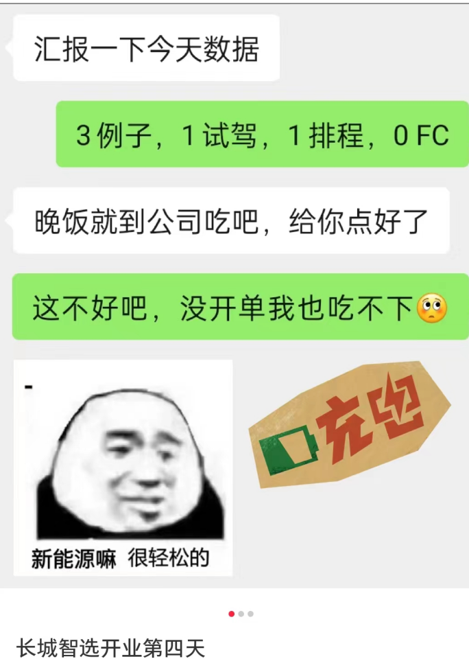 另有长城智选的销售称,才到店四天就被领导给下了很高的指标,“每天需要有4个例子,两个试驾,N个排程”。上班的时候,会被店长时刻监控销售过程指标,如果完不成就要和店长共进晚餐。