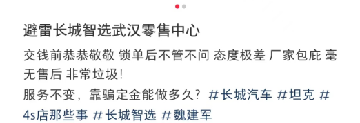 在售后服务方面,也有不少用户吐槽。比如长城智选在成都锦江香格里拉的黑漆漆地下停车场交付、隐瞒贷款是抵押贷、支付首付后才告知无法开成都支票、工作人员不专业、前后端联系靠客户本人,“总体交付体验极差”。