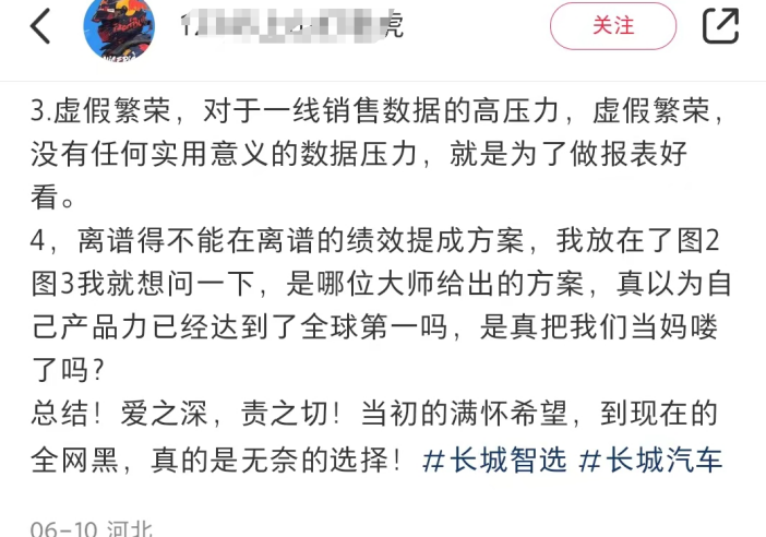 而在部分销售人员看来,长城直营店很看重销量。部分门店推行两个月不开单就开除以及多重kpi的管理策略。“繁荣”的指标占据了销售非常多的时间,极大地降低了用户的体验。在车tech以客户身份与长城智选销售咨询的过程中,多数销售在加微信后便不再主动跟进。此外,在小红书中,也有消费者吐槽长城智选销售“交钱前恭恭敬敬,锁单后不管不问,十分垃圾”。