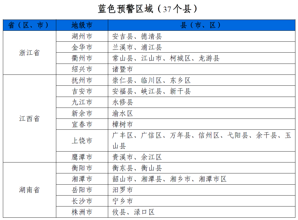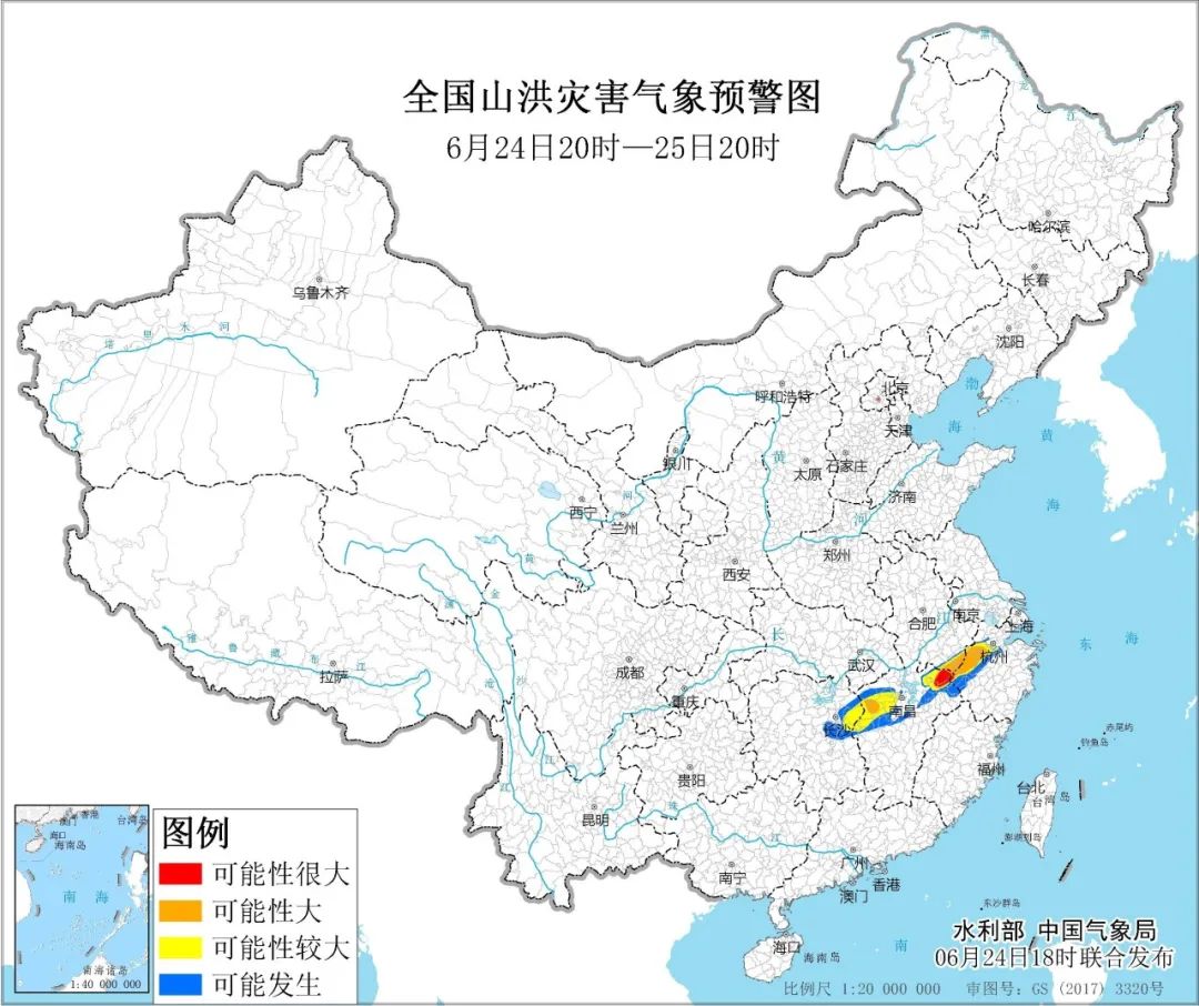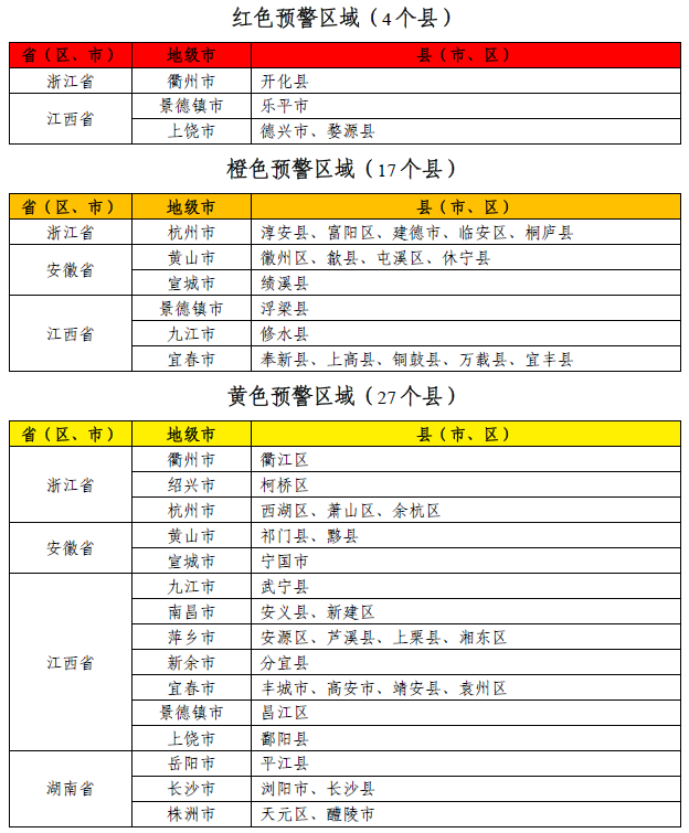 水利部和中国气象局6月24日18时联合发布红色山洪灾害气象预警:预计,6月24日20时至6月25日20时,浙江西部、安徽南部、江西东北部和西部等地部分地区发生山洪灾害可能性大(橙色预警),其中,浙江西部、江西东北部局地发生山洪灾害可能性很大(红色预警),预警区域涉及的县(市、区)见下表。其他地区也可能因局地短历时强降水引发山洪灾害,请各地注意做好实时监测、防汛预警和转移避险等防范工作。